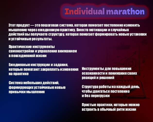 В продукт входят практические инструменты для работы с состоянием и вниманием.